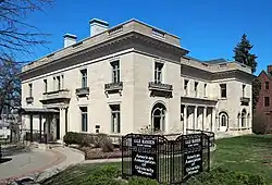 The Hennepin History Museum was formerly the George H. and Leonora Christian House. It was designed by local architects Hewitt and Brown using Renaissance Revival elements such as a balustraded roof. George Christian was the manager of the Washburn-Crosby milling company in the 1860s and helped to perfect the "new process" of milling hard spring wheat to make a pure white flour. This process made Minneapolis flour highly competitive with flour from other mills. The building now houses the Hennepin History Museum.[2] The building is not listed on the National Register, but is part of the local historic district.