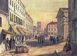 The Spanish water infrastructure continued to be used by the British well after the capture of Gibraltar in 1704. As late as 1863, there was not a single water pipe in the town apart from the Spanish aqueduct.[12] The main source of drinking water, other than the aqueduct, was rainwater that had been collected during the winter. The British military relied on large cisterns mounted on the roofs of buildings to gather rainwater, while ordinary Gibraltarians used barrels and large earthenware pots called tinajas. At the time, most Gibraltarians lived in two- or three-storey buildings with an interior courtyard, called patios, which were occupied by two or three families. They were generally owned either by absentee landlords or the British government, neither of which had much interest in building private cisterns. The courtyards of the patios were thus crowded with barrels and tinajas which supplied the occupants' water during the summer drought. If they ran out, the only other source of water was from pedlars who brought barrels of water in from Spain, charging high prices for the privilege. This encouraged many people to recycle their water as much as possible, reusing the same water for different purposes.[13]
