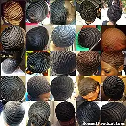 The hairstyle is achieved with a short-cropped haircut on top and frequent brushing and/or combing of the curls (which trains the curls to flatten out), as well as wearing a silky durag or a wave cap to add extra strength to flatten longer hair types.[1] Wave pomades and moisturizers can help hold the hair in place while preventing the hair from getting too dry.[2][3][4] A durag is worn to preserve moisture while compressing the hair and holding it in place to create the desired waves.[5][6][7]