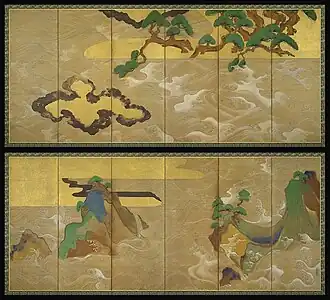 Waves at Matsushima, also known as Pine Islands,[3][6][7] is a pair of paintings on two six-fold screens,[8][9] in the medium of ink, color, gold, and silver on paper.[10] Each are 12 feet in width. The paintings have been associated with the coastline of Matsushima, though the paintings were named after their creation, and likely represent no specific location.[1][11]