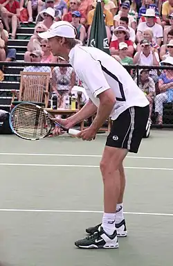 His serve was his strongest weapon by far, and had been referred to as the "best in the world" by several of his fellow players, including Jim Courier,[1]Andre Agassi,[2]Thomas Johansson,[3] and Ivo Karlović.[4] He consistently had one of the highest ace counts on the ATP Tour and favours a serve-and-volley style of play.