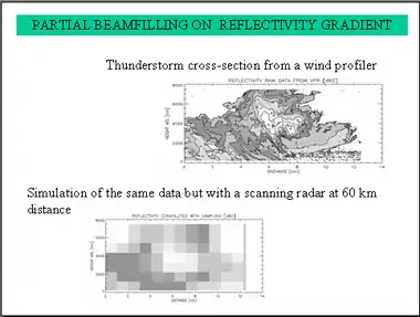 However, the rain drops are falling. As the radar only sees the radial component and has a certain elevation from ground, the radial velocities are contaminated by some fraction of the falling speed. This component is negligible in small elevation angles, but must be taken into account for higher scanning angles.[15]
