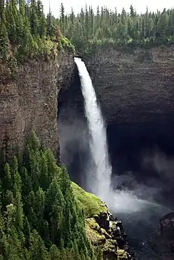 At the end of the last ice age approximately 10,000 years ago, massive floods from the melting glacial ice carved deep canyons into the underlying plateau-capping lava flows.[4] Most of these canyons contain rivers such as the Murtle and Clearwater, and waterfalls such as Canim Falls, Moul Falls, Spahats Falls and the 141 m (463 ft) high Helmcken Falls.[4] The faces of the basaltic lava flows and waterfalls remain vertical due to the nature of the basaltic lava flows.[4] Basaltic lava shrinks as it cools and forms vertical columns of rock called columnar basalt.[4] More recently, the southern end of the volcanic field has experienced continuous volcanic activity since the end of the last ice age. This volcanic activity occurred in three areas; Spanish Creek, Ray Lake and Kostal Lake which were followed by lava fountain eruptions creating cinder cones and lava flows.[6]