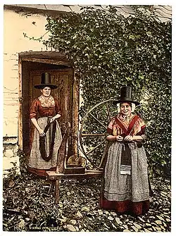 The Welsh traditional costume (Welsh: Gwisg Gymreig draddodiadol) was worn by rural women in Wales. It was identified as being different from that worn by the rural women of England by many of the English visitors who toured Wales during the late 18th and early 19th centuries. It is very likely that what they wore was a survival of a pan-European costume worn by working rural women. This included a version of the gown, originally worn by the gentry in the 17th and 18th centuries, an item of clothing that survived in Wales for longer than elsewhere in Britain. The unique Welsh hat, which first made its appearance in the 1830s, was used as an icon of Wales from the 1840s.[1]
