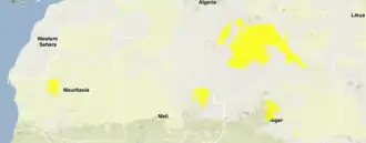 This ecoregion has an area of 258,100 km2 (99,700 sq mi). The boundaries for the largest part of this ecoregion, which includes the Tassili n'Ajjer Ahaggar and Aïr (or Azbine) massifs, follow the 'regs,' 'hamadas' and 'wadis' above the 1,000 m contour. This covers a good part of southeast Algeria. These areas reach almost 3,000 meters in altitude. Additional areas further south were included within this ecoregion, including the Aïr ou Azbine in northern Niger, Dhar Adrar in Mauritania, and Adrar des Iforas in Mali and Algeria, using the 500 m-elevation contour.[2]