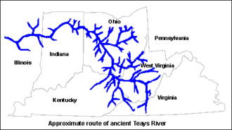 The Quaternary ice age (2.6 million BCE) began during the Pleistocene Epoch. Sitting snugly in the then much higher mountains was Glacial Teays Lake, extending from south Virginia through the New Kanawha River to its northerly drainage river, the ancient Teays River. It flowed through Ohio to central Indiana, then across Illinois to the Mississippi Valley. The Pittsburgh drainage basin is to the north of the river.[7] The Mississippi River at the time was an embayment of the Gulf of Mexico reaching to Illinois. Glacial Teays Lake last occurrence was about two million years ago when it outburst and the wash build up created the final large prehistoric lake in the western part of the state. Lake Tight lasted 6500 years before it escaped its confines to form the Ohio Valley.[8] The Ohio-Allegheny system (Ohio Valley) in western half of the state had its present form by the Middle Pleistocene, between 781 and 126 thousand years ago.[9] The glacial Monongahela Lake was in the northern part of the state. It was blocked by ice terraces in the northwestern Pennsylvania. Upon the ice's retreat, it outburst through the basin to the north.