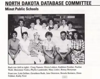 In contrast to the previous titles which were developed internally by Broderbund, North Dakota was largely developed for the Apple II by a team of fourteen educators led by computer coordinator Craig Nansen, concept designer Bonny Berryman, and co-chairwoman Mary Littler[1] collectively known as the North Dakota Database Committee (NDDC) of the Minot Public Schools, who made the game idea a reality.[1][2][3]