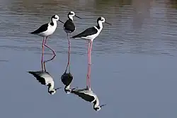 This stilt chooses mudflats, desiccated lacustrine verges, and levees for nest locations, as long as the soil is friable. The nests are typically sited within 1 km (0.62 mi) of a feeding location, and the pairs defend an extensive perimeter around groups of nests, patrolling in cooperation with their neighbors.[2] Spacing between nests is approximately 65 ft (20 m), but sometimes nests are within 7 ft (2.1 m) of each other and some nests in the rookery are as far as 130 ft (40 m) from the nearest neighbor. The nests are frequently established rather close to the water edge, so that their integrity is affected by rising water levels of ponds or tides. This is particularly a hazard in the case of managed salt ponds where water levels may be altered rapidly in the salt pond flooding process.[3]