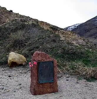 The White Ash Mine was abandoned after the flood and the bodies of the ten miners were never recovered.[3] They are commemorated by a bronze statue in the Mines Museum of Earth Science, shown at right above, and by an information plaque placed near the site of the shaft at the west end of 12th Street in Golden by the Colorado School of Mines. An older bronze plaque at the site, shown at left, reads as follows: