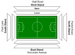 The new location was to the east of Tottenham High Road. The site was formerly used as a nursery owned by the brewery company Charringtons. The ground was leased from Charringtons with the proviso that Spurs must guarantee crowds of 1,000 for first-team matches and 500 for the reserves, easily achievable when the average attendance of Tottenham's matches was 4,000.[21] A groundsman at a local cricket club, John Over, was tasked with demolishing the greenhouses and preparing a playing surface for football.[15] The stands from the previous ground at Northumberland Park were moved to the new ground.[22] The new ground was never officially named, although names such as Gilpin Park and Percy Park were suggested.[23][24] In its early days it was normally referred to as the Hotspur's or Spurs' Ground by the club or the High Road Ground by the public, in time it became popularly known as White Hart Lane, which is in fact the name of the street on the western side of High Road, away from the ground. It is however unclear how it became so-named; some thought that it acquired the name because spectators would first meet up at the White Hart Lane railway station, another suggestion is that it referred to the lane leading to the stadium entrance beside the White Hart pub later officially named Bill Nicholson Way.[25]
