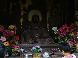 In the Main Hall, at the altar, there are three statues, the central statue is that of Sakhyamuni Buddha flanked by statue of Manjushri and Samantabhadra. There is a very large bell weighing more than 1 tonne (a figure of 2.5 tonnes is also mentioned), installed during the reign of the Jiajing Emperor of the Ming dynasty, near the altar, which is struck in time during the chanting of prayers by the monks. A community of ten thousand monks resided here during the Tang dynasty.[1][38] The inscription on the bell reads: "The sound of the Bell resounds in Buddha's temple causing the ghosts in Hell to tremble with fear."[39]