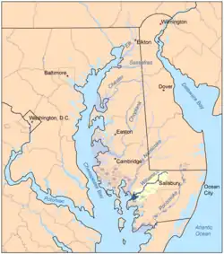 ![]() Map of the rivers of the Eastern Shore of Maryland with the Wicomico and its watershed highlighted. | |
