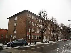 The school building at 6 Wileńska Street, initiated by Adolf Kaschny, was completed in stages, first in 1932 and fully by 1 April 1934. Initially, it housed three vocational schools: the Crafts Vocational School (Gewerbliche Berufsschule), the Merchant School (Kaufmännische Berufschule), the School for Pharmacists (Drogistenfachschule), as well as the Higher Commercial School (Höhere Handelsschule) and the Municipal Commercial School (Städtische Handelsschule).[2][15][16] The building was equipped with an air-raid shelter, and in 1944, a lazaretto was established there.[2] Toward the end of World War II, one corner of the building was destroyed by a bomb. On 24 June 1945, the Polish authorities took over the building, and classes resumed as early as 15 October that year. On 1 September 1946, a carpentry class and two additional vocational training classes were launched. Over the years, many types of schools operated in the building.[31] Currently, it houses Technical School No. 2, Supplementary Technical School No. 2 for Adults, Vocational School No. 2, and Post-Secondary School No. 2.[32] The school also includes a gymnasium built in 1894, which originally served as the town's sports hall before the school's establishment.[10][15][16]