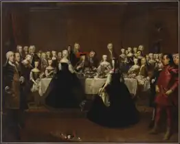 Wedding breakfast of Maria Theresa of Austria and Francis of Lorraine, with the Dowager Empress Wilhelmine Amalie in attendance at the left side of the table, c. 1736