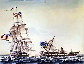 On 15 September, shortly after the War of 1812 broke out between the United Kingdom and the United States, Bainbridge was appointed to command the 44-gun frigate USS Constitution, succeeding Captain Isaac Hull.[26] Constitution was an enormous frigate of 1,533 tons, armed with 24-pounders, which had already captured the 38-gun frigate HMS Guerriere of 1,072 tons. Under Bainbridge, she was sent to cruise in the South Atlantic.[14][27]