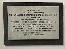 In 1888 he married Lady Eveline Camilla Wallop, daughter of the 5th Earl of Portsmouth.[11] She died in 1894.[11] There is a memorial to them both in the church of St Edmund in Assington, Suffolk.
