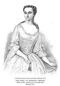 Byrd courted Lucy Parke, daughter of Jane Ludwell Parke and Daniel Parke (1664–1710), who was Governor of the Leeward Islands.[1][4] Lucy lived near Colonial Williamsburg at the Parke's Queen's Creek plantation in York County, Virginia with her mother and her sister Frances. Her father, who lived with his mistress, forbade the women from entertaining male callers and did not provide the money for them to have clothes of their station. This made it difficult for Frances and Lucy to have suitors. Byrd, though, knew Parke and his aristocratic connections, and was favorably impressed with Parke's daughters, particularly Lucy.[5] Byrd married Lucy on May 4, 1706, at the Queen's Creek plantation. Frances was married on the same day to John Custis (1678–after 14 November 1749).[6]