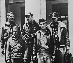 The crew of the Bat Out of Hell (crew #16) just before take off for the Doolittle Raid on USS Hornet (CV-8), 18 April 1942. (Left to right) Lt. George Barr (navigator), Lt. William G. Farrow (pilot), Sgt. Harold A. Spatz (engineer-gunner), Lt. Robert L. Hite (co-pilot) and Sgt. Jacob DeShazer (bombardier)