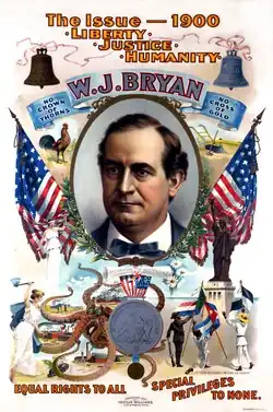 With the implosion of Dewey's candidacy, 1896 Democratic presidential nominee and former congressman William Jennings Bryan became the front-runner for the 1900 Democratic presidential nomination.[2] Even though various prominent Democrats tried to convince Bryan to drop his support of free silver (due to the fact that, unlike in the 1896 election, the economy was recovering and in good shape at this point in time), Bryan refused and threatened to run as an independent if the Democrats didn't adopt a pro-free silver plank.[2][3] Ultimately, Bryan won out and free silver was put into the 1900 Democratic platform by a one-vote margin--with Bryan becoming the 1900 Democratic presidential nominee.[2] In addition, the Democrats criticized the Republicans for their imperialism, for the Philippine–American War, and for the proliferation of trusts.[2][3]