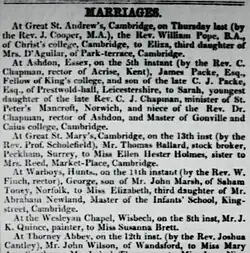 - ^ "Marriages". Cambridge Independent Press. 14 October 1848. p. 3 col.8. Retrieved 21 July 2024 – via British Newspaper Archive.