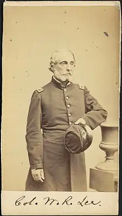 William Raymond Lee (August 15, 1807 – December 26, 1891) was an officer in the Union Army during the American Civil War. He was born in Salem, Massachusetts. His father was also named William Raymond Lee and his mother was Hannah Lee (née Tracy). He married Helen Maria Amory and had 3 children: Elizabeth Amory (b. 1843), Arthur Tracy (1844–1870) and Robert Ives (b. 1846). He served as colonel of the 20th Massachusetts Infantry Regiment and led it during the Battle of Antietam. A veteran of several major battles, Lee suffered a mental break down the morning after Antietam and abandoned his regiment. According to a subordinate, Lee was found a few weeks later “without a cent in his pocket, without anything to eat, without having changed his clothes for 4 weeks, during all which time he had this terrible diarrhea…. He was just like a little child wandering away from home.”[1][2] After the war ended he was brevetted brigadier general.