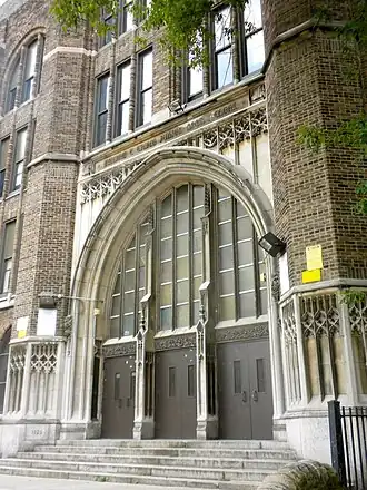 Designed by Irwin T. Catharine and built between 1926 and 1927, this historic structure is a three-story, eleven-bay, brick and limestone building that was created in the Late Gothic Revival style. It features projecting end bays with one-story entrances, brick piers, and a crenellated parapet.[2]