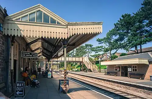 The Gloucestershire Warwickshire Railway reopened the line between Toddington and Winchcombe on 2 August 1987.[28][29] A signal box was obtained from Hall Green and rebuilt on the foundations of the original structure,[30] with the 37-lever frame coming from Honeybourne West Loop Box.[31] The former Great Western Railway station building at Monmouth Troy was dismantled stone-by-stone and re-erected at Winchcombe in 1986.[32] The platform slabs came from Birmingham Snow Hill and Cheltenham St James.[31] The only original buildings left are the old goods shed, now the main workshop for the carriage and wagon group on the railway, and the weighbridge. Bidirectional signalling has been installed as has a passing loop through the station, which has been operational since 12 July 1997. [33] Since 2012, the station, and indeed parts of the line itself, have been used for scenes in the television series Father Brown.