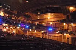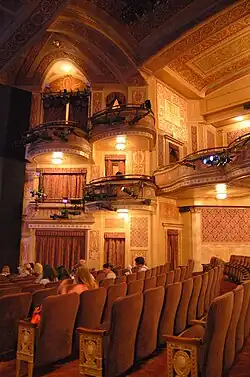 On either side of the stage is an outwardly splayed wall section with boxes at the balcony level and directly above the balcony. Both levels have three boxes on either side, which are curved outward.[28] The fronts of the boxes have similar molded bands, swags, and foliate ornament as the balcony's front. In addition, the centers of the boxes have rosettes and oval panels. Pilasters with Adam-style decoration, running the full height of the auditorium, flank the boxes' wall sections. Each of the boxes' pilasters is topped by a Corinthian capital. There are griffin motifs and cartouches above the higher level of boxes.[37] The present boxes and pilasters date from the 1923 renovation.[23][34] The original design had only one level of boxes, which was at the balcony level.[18][34] In the original design, the entire balcony front was occupied by a row of 21 boxes, and the wall sections on each side had two large party boxes,[18] for a total of 25 boxes.[4]