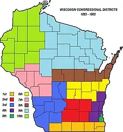 Following the census of 1890 Wisconsin gained a 10th Congressional seat. The 6th District shifted eastward to a configuration that closely resembled that of today's linear east to west shape with a population of 187,001. The state population was enumerated at 1,686,880. The 6th District then included the counties of Calumet, Fond du Lac, Green Lake, Marquette, Marquette, Waushara and Winnebago.