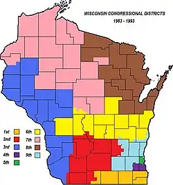 The 1990 census saw Wisconsin retain its nine seats in the House of Representatives and created only minor changes to the 6th District. All or portions of Adams, Brown, Calumet, Fond du Lac, Green Lake, Juneau, Manitowoc, Marquette, Monroe, Outagamie, Sheboygan, Waupaca, Waushara, and Winnebago counties were part of the Sixth.