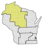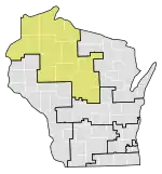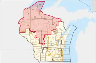Wisconsin's 7th congressional district is a congressional district of the United States House of Representatives in northwestern and central Wisconsin; it is the largest congressional district in the state geographically, covering 20 counties (in whole or part), for a total of 18,787 sq mi. The district contains the following counties: Ashland, Barron, Bayfield, Burnett, St. Croix, Chippewa (partial), Clark, Douglas, Florence, Forest, Iron, Jackson (partial), Juneau (partial), Langlade, Lincoln, Marathon, Monroe (partial), Oneida, Polk, Price, Rusk, Sawyer, Taylor, Vilas, Washburn, and Wood (partial).
