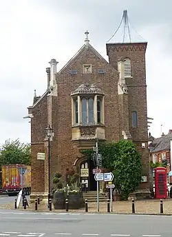Woburn Town Hall, designed by Edward Blore, was completed in 1830.[7] Under the 8th Duke of Bedford, a new parish church was completed in Woburn in 1868. It was equipped with a crypt beneath, which was originally intended as the burial place of the Dukes of Bedford and their family. In the end the dukes continued to use the ancient mausoleum at St Michael's, Chenies, and the crypt of St Mary's parish church in Woburn is now used for events and meetings. The hatch through which coffins would have been lowered into the crypt is still visible.[8]