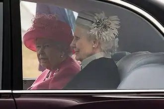 Queen Elizabeth II maintained an establishment of at least four Women of the Bedchamber, one of whom at a time was usually in attendance.[2] For most of the Queen's reign they served in rotation, remaining on duty for a fortnight at a time, during which period they were referred to as 'Lady-in-Waiting to Her Majesty' or 'Lady-in-Waiting to The Queen'.[3] The establishment was supplemented by 'extra' Women of the Bedchamber, who might take turns on a more occasional basis.[2]