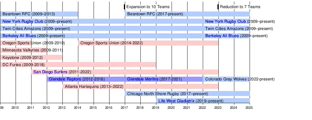 The League began with 8 clubs: Beantown Rugby, Berkeley All Blues, New York Rugby Club, Washington DC Furies, Twin City Amazons, Keystone Rugby Club, Minnesota Valkyries, and Oregon Sports Union (ORSU).[2]