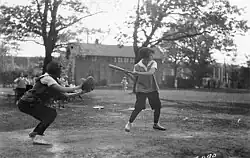 There is evidence that at least one woman, Amanda Clement, was umpiring semi-professional games as early as 1905.[120] "Mandy", as she was called, grew up near a ballpark in her hometown of Hudson, South Dakota, where she was introduced to baseball by her brother Henry.[121] Clement began umpiring while a student at Yankton College, and gained fame nationwide for her knowledge of baseball and her accuracy in umpiring the games. She was paid between $10 and $15 per game, which helped pay her tuition.[122] She umpired games in North Dakota, Iowa, Minnesota, Nebraska, and South Dakota until at least 1909, and later became a physical education instructor for high school and college women's teams.[123] She still would umpire an occasional semi-pro game in South Dakota even during the 1910s.[124] There were several other woman umpires in the early 1920s: one was Deana Ernest of Toledo, Ohio, who umpired semi-pro games in the area, and also managed a city league team there.[125][126] Another was Nina Belle Hurst, a resident of Sawtelle, California, who umpired in the Southern California Baseball Managers Association.[127] During World War II, there were also some women who umpired, including some the press jokingly referred to as "WUMPS" (women umpires). Among them was Lorraine Heinisch, of Kenosha WI, who umpired semi-pro games in 1943, including a championship game in Wichita, Kansas.[128]