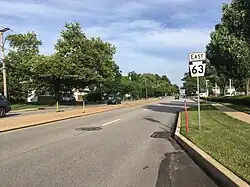 PA 63 enters the Northeast Philadelphia section of the city a short distance past the Pine Road intersection. PA 63 widens into a four-lane divided highway and passes between a former golf course (site of the former Budd Company Red Lion plant) to the north and homes and industrial developments to the south. The road continues through a mix of residential and commercial development as it crosses Verree Road and PA 532 (Bustleton Avenue). East of PA 532, the route passes over CSX's Trenton Subdivision railroad line and comes to an intersection with US 1 (Roosevelt Boulevard).[3][5]
