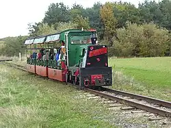 Woodhorn Narrow Gauge Railway is a 2 ft (610 mm) narrow gauge railway at Woodhorn in the Queen Elizabeth II Country Park. There are two preserved locomotives. One is a Hunslet Locomotive, which was built in 1975 for work at Vane Tempest colliery in Seaham. The second is a German Schoma locomotive, called Edward Stanton, which was used in the factory where the concrete sections were made for the Channel Tunnel. There are also three carriages called Eddie, Harry and Ken. They and the Schoma are named after original members of the society. The park also features a 40-acre (160,000 m2) lake and hiking and biking trails.