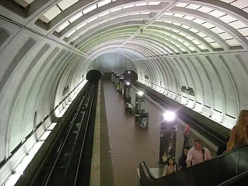 Like other stations on the Red Line constructed with rock-tunneling methods, it is rather deep, at 150 feet (46 m) below ground. After Forest Glen, it is the second deepest station in the system.[4][5] The escalators have a vertical rise of 102 feet (31 m); they are the longest in the District of Columbia and the third longest on the Metrorail system (behind Wheaton and Bethesda).[6]