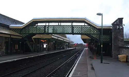 The station is staffed part-time (ticket office open Monday - Friday 07:00 - 17:00, Saturday 07:00 - 13:30, closed Sundays); self-service ticket machines are also provided for use outside these times and for collecting advance-purchase tickets. Refreshment facilities are available via a cafe on platform 2, a public house on platform 1 and from vending machines on both sides. Canopies provide covered waiting areas on both platforms – these are also fully accessible for disabled passengers. Train running information is offered via automatic announcements, timetable posters and digital display screens.[3]