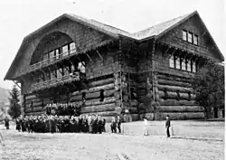 The World Forestry Center has its roots in the 1905 Lewis and Clark Centennial American Pacific Exposition and Oriental Fair for which an enormous log cabin was built of huge native trees and advertised as the world's largest.[3] Public interest in the Forestry Building, which was turned over to the State of Oregon, lasted long after the exposition ended, right up until it was destroyed by fire on August 17, 1964.[2]