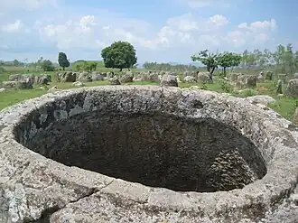 The first landmark is the Plain of Jars. The "jars" are 2,100 tubular-shaped megalithic stone jars used for funerary purposes. The jars range from 1–3 metres (3 ft 3 in – 9 ft 10 in) in height. They are found throughout the province in clusters containing from one to some hundred jars each. The jars date from the Iron Age (500 BCE–500 CE).[20] Nearest to Phonsavan is Jar Site 1, with an area of 25 hectares (ha). The largest jar found here is 2.5 m x 2.5 m, while the rest are half this size. One jar has decorations on it.[19][21] The megalithic jar sites of Xiangkhouang were inscribed on UNESCO's list of World Heritage Sites in July 2019.[20]