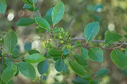 | A photo by Facundo Chieffo of Xylosma tweediana displaying its leaves and immature fruits. | |