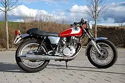 The Yamaha SR400 (1978–2021) and SR500 (1978–1999) are single-cylinder, air-cooled, two-passenger motorcycles manufactured in Japan by Yamaha Motor Company as a street version of the Yamaha XT500, with a standard riding posture and styling recalling the Universal Japanese Motorcycles of the 1970s. The two models differ by their engines: the SR400 engine has a lower displacement, achieved with a different crankshaft and shorter piston stroke[3][4] and both models feature only kickstarting, i.e., no electric starter.