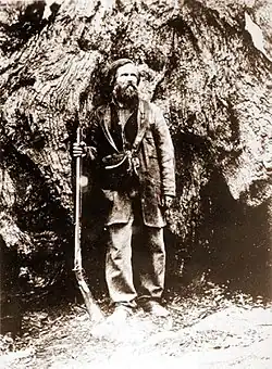 Yosemite tribes often stole from settlers and miners, sometimes killing them, in retribution for the extermination/domestication of their people, and loss of their lands and resources.[11] The War and formation of the Mariposa Battalion was partially the result of a single incident involving James Savage, a Fresno trader whose trading post was attacked in December, 1850. After the incident, Savage rallied other miners and gained the support of local officials to pursue a war against the Natives. He was appointed United States Army Major and leader of the Mariposa Battalion in the beginning of 1851.[11] He and Captain John Boling were responsible for pursuing the Ahwahneechee people, led by Chief Tenaya and driving them west, and out of Yosemite.[27][11] In March 1851 under Savage's command, the Mariposa Battalion captured about 70 Ahwahneechee and planned to take them to a reservation in Fresno, but they escaped. Later in May, under the command of Boling, the battalion captured 35 Ahwahneechee, including Chief Tenaya, and marched them to the reservation. Most were allowed to eventually leave and the rest escaped.[11] Tenaya and others fled across the Sierra Nevada and settled with the Mono Lake Paiutes. Tenaya and some of his companions were ultimately killed in 1853 either over stealing horses or a gambling conflict. The survivors of Tenaya's group and other Ahwahneechee were absorbed into the Mono Lake Paiute tribe.[11][28][29]