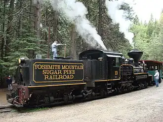 The Yosemite Mountain Sugar Pine Railroad (YMSPRR) is a historic 3 ft (914 mm) narrow gauge railway with two operating steam locomotives located near Fish Camp, California, in the Sierra National Forest near the southern entrance to Yosemite National Park.[1] Rudy Stauffer organized the YMSPRR in 1961, utilizing historic railroad track, rolling stock and locomotives to construct a tourist line along the historic route of the Madera Sugar Pine Lumber Company.
