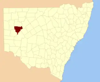 Young County is one of the 141 cadastral divisions of New South Wales. It includes the area to the west of Wilcannia. The Darling River is the south-eastern boundary.