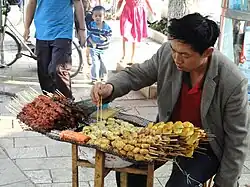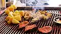 Street barbeque vendor in Kunming. Jianshui tofu is at the centre. Clockwise from top: Shiping tofu, potato skewers, Jianshui tofu skewers, processed meat sticks, probably beef skewers (often fatty) and another type of meat.