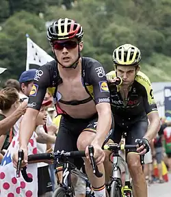 Lampaert won the 2017 Dwars door Vlaanderen, a local race for him,[6] after he soloed away to the victory after making the race-defining split along with teammate Philippe Gilbert, Alexey Lutsenko from the Astana team, and Orica–Scott's Luke Durbridge.[7] Lampaert attacked with 7.5 kilometres (4.7 miles) remaining and ultimately won the race by 39 seconds ahead of Gilbert.