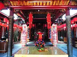 The interior of the temple contains sculptures of carp leaping into the air, while the swallowtail roof is decorated with dragon sculptures. In Chinese mythology, a carp turns into a dragon if it leaps across Longmen, a ravine on the Yellow River; the sculptures are a metaphor for Tsai clan descendants to mature and prosper. The temple also contains a plaque dating from 1864 that was gifted by Changhua county magistrate Wang Zhen (王楨) for the deity's assistance in quelling the Tai Chao-chuen incident.[2]