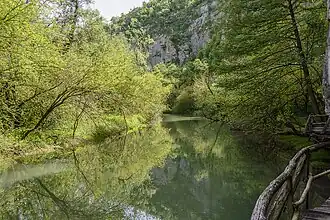 High water in May and low water in October–November, although the water flow is fairly constant throughout the year due to the karst water feed. The average annual discharge at the village of Petrevene is 4 m3/s.[1][2]